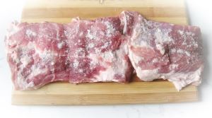 Свиную шейку помыть и разрезать по кругу. Должен получиться пласт мяса. Его нужно посолить и поперчить по вкусу.