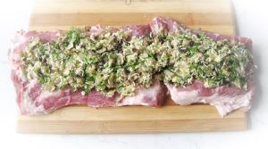 На пласт свинины выложить начинку.