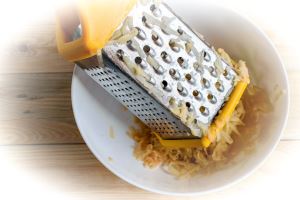 Картофель чистим, моем и натираем на крупной тёрке.