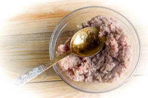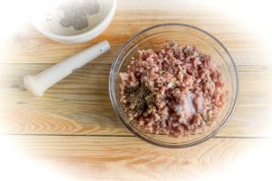 Для начинки к мясному фаршу добавляем перец и соль, опять же по вкусу.