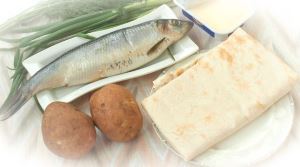 Для приготовления рулета нам понадобится армянский лаваш, солёная сельдь, картофель, плавленый сыр, зелёный лук и укроп.