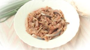 Селёдку следует разобрать на филе, удалить по возможности все косточки. Нарезать селёдку тонкими пластинками.