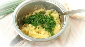 Картофель почистить и сварить в подсоленной воде, размять в пюре. В готовое пюре добавить измельчённый укроп.