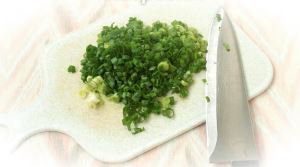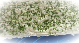 Расстелить на столе лист лаваша, смазать его плавленым сыром и посыпать зелёным луком.