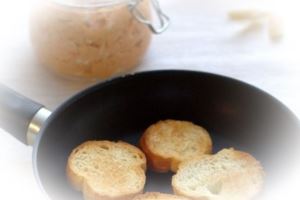 Вкусно подавать паштет на гренках. Багет нарезать на кусочки и обжарить на сухой сковороде до лёгкого румянца и хрустинки.