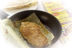 На половину листа для жарки приправы Магги положить одну куриную грудку, накрыть второй половиной листа и прижать сверху рукой.