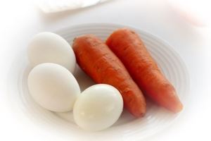Пока грудка остывает, отварить морковь в подсоленной воде с добавлением 1 лаврового листа и пару зёрен душистого перца. Готовую морковь остудить в воде, в которой она варилась.