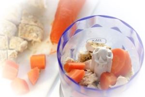 В чашу блендера сложить остывшую и нарезанную на кусочки куриную грудку, варёную морковь. С лука слить маринад и тоже положить к остальным ингредиентам. Пробить блендером.