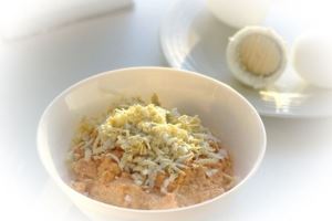 Варёное яйцо натереть на крупной тёрке и добавить к паштету.